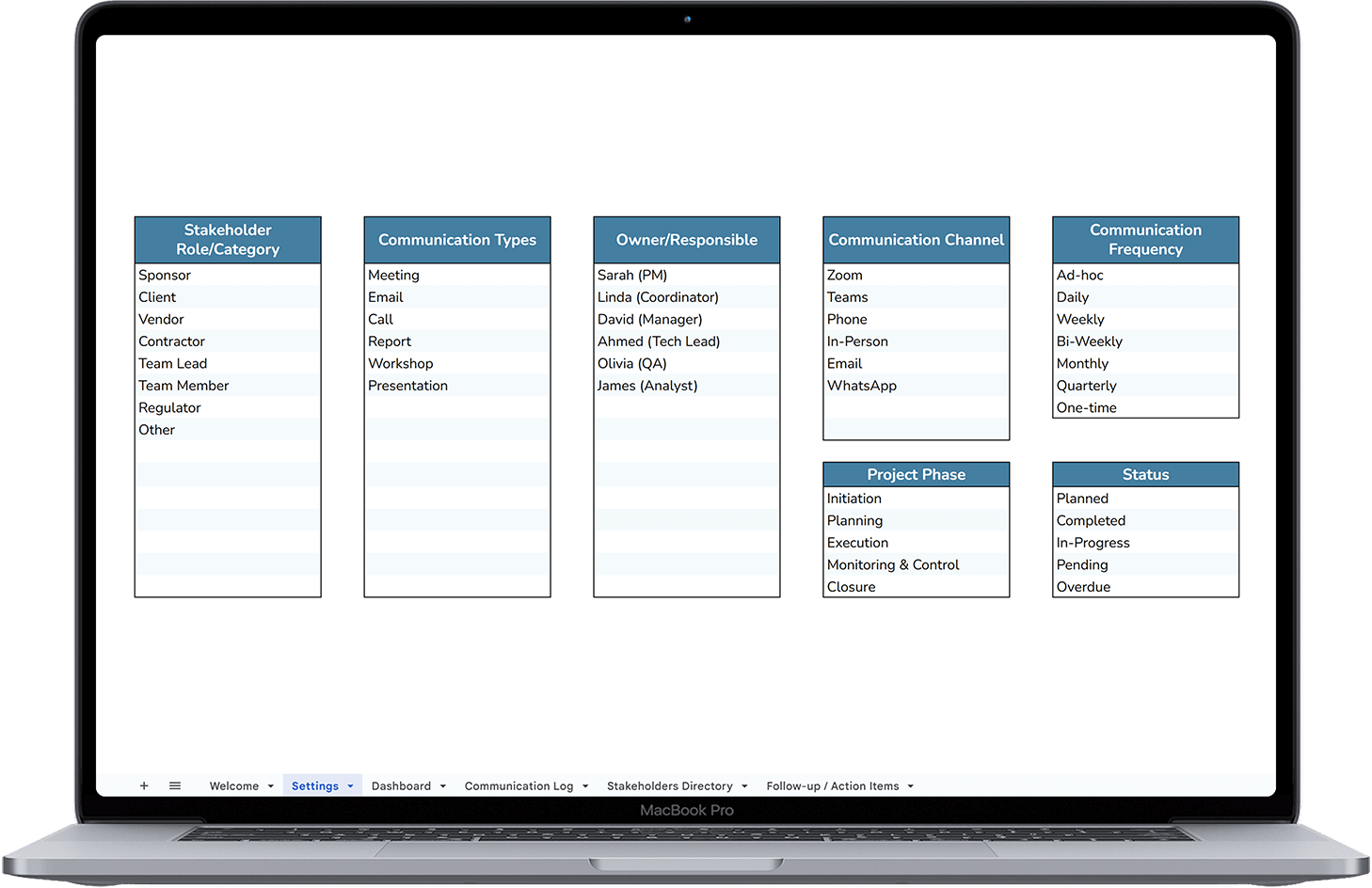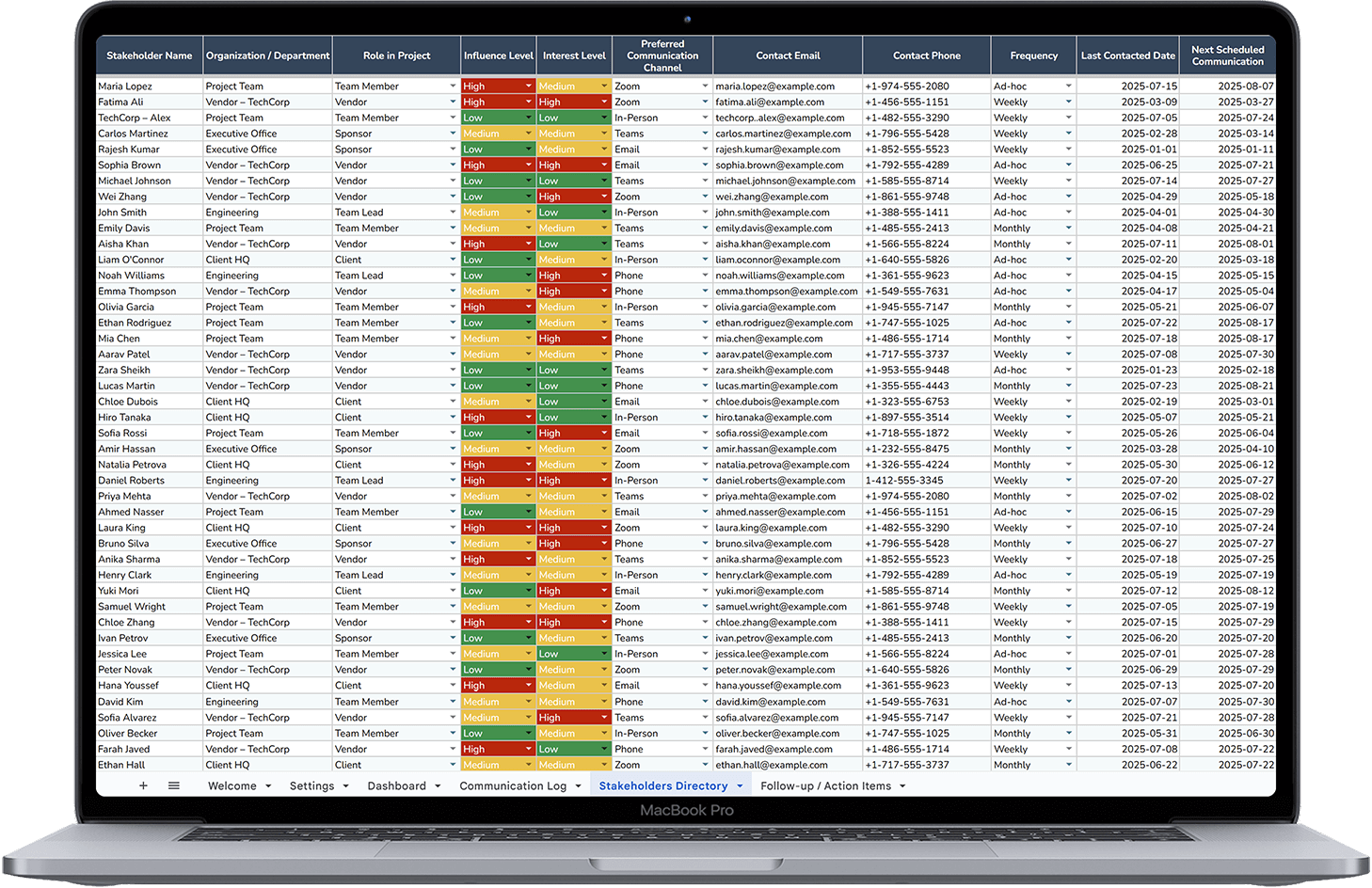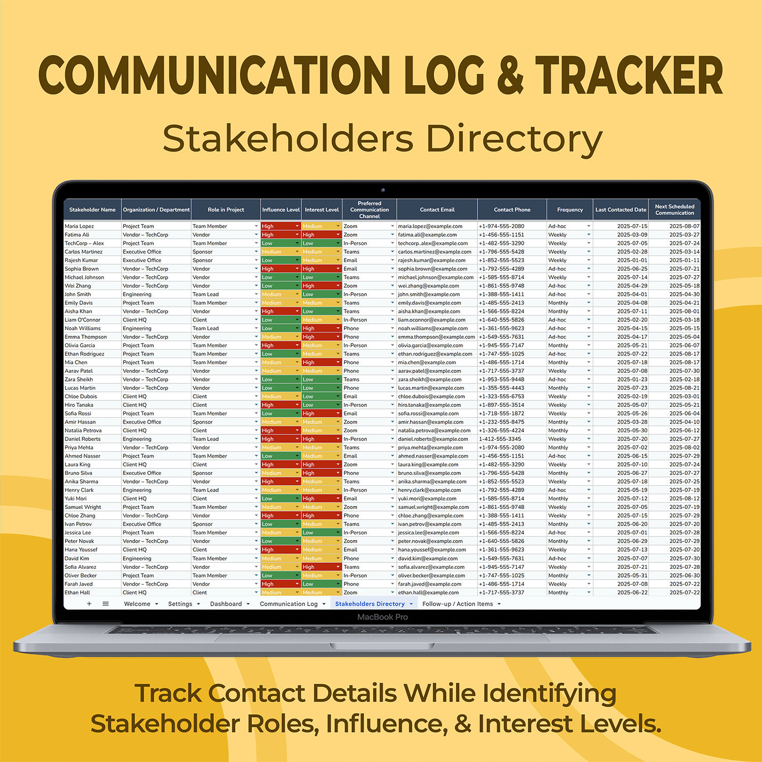✔ Comprehensive Contact Records: Store stakeholder names, roles, emails, and phone numbers.