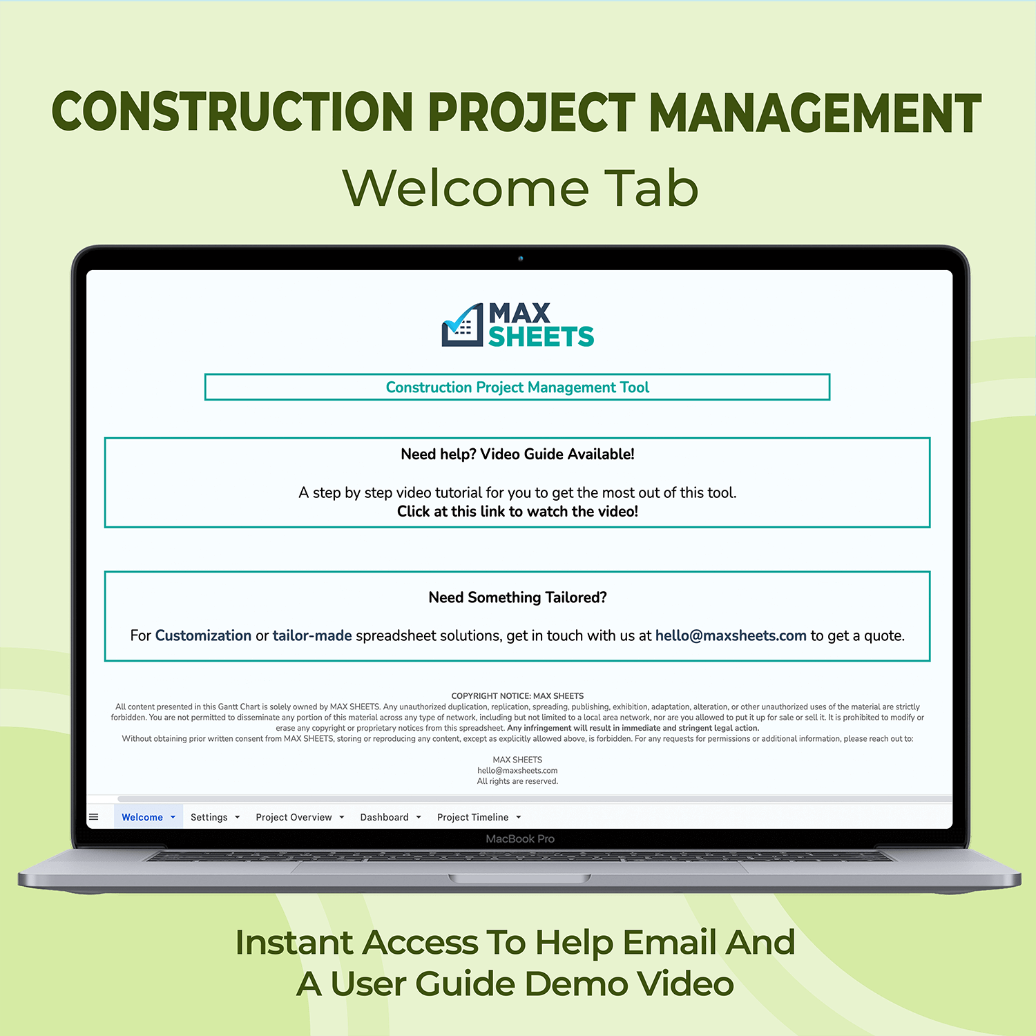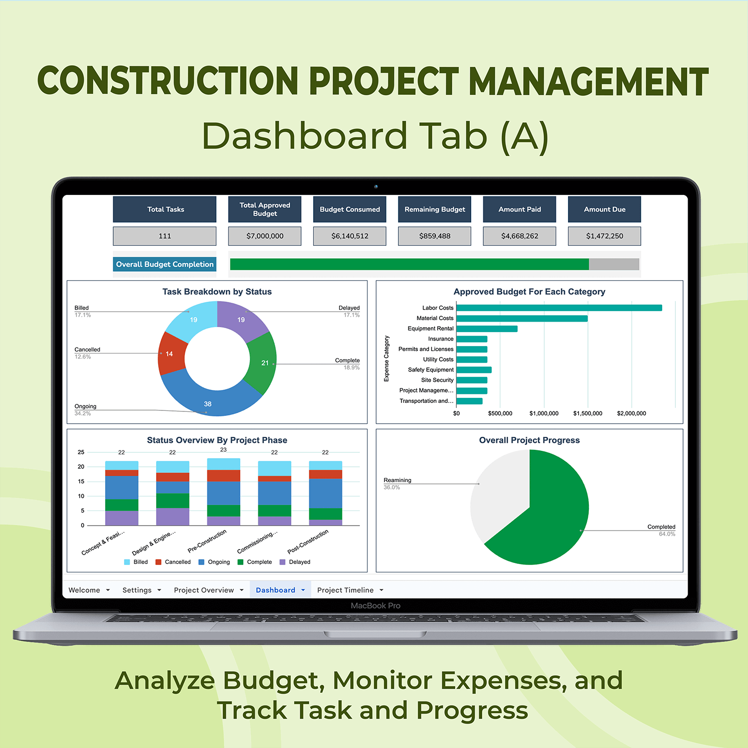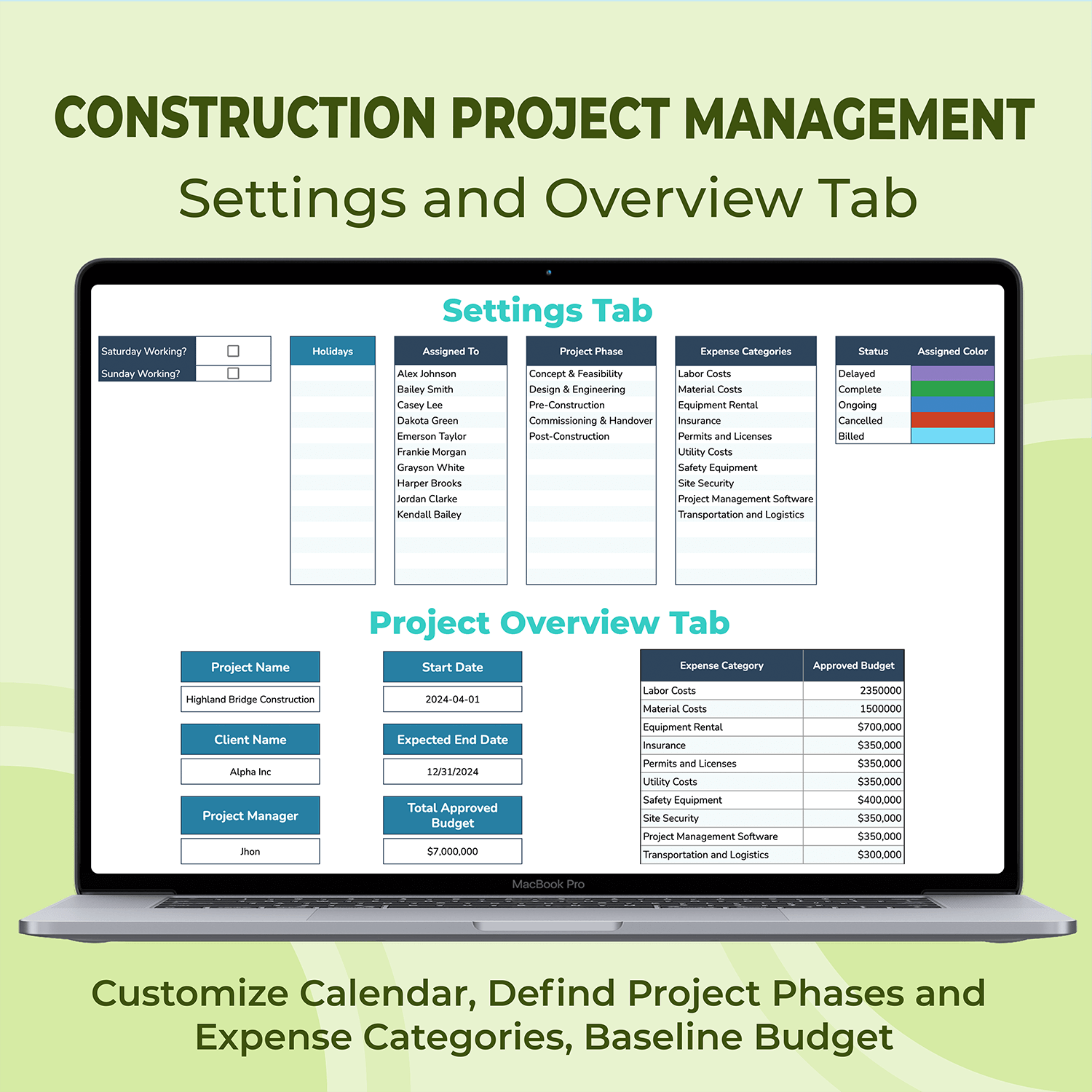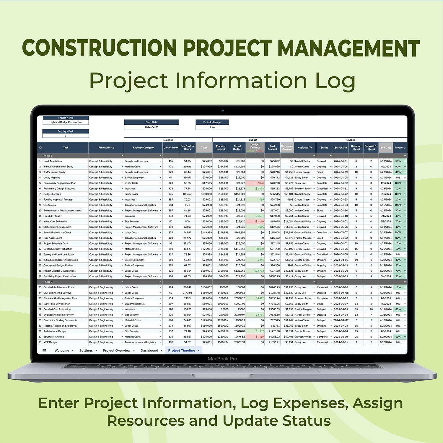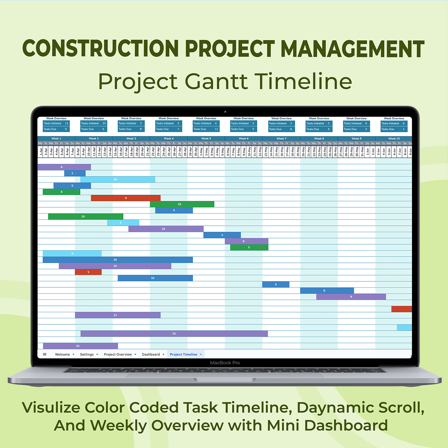 ✔ Gantt Chart: Color coded project timeline for easy planning.